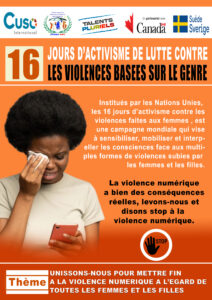 AFEMA – RDC étant l’un des partenaires de mise en œuvre des activités du projet talents pluriels dans la ville de Bukavu a organisé des journées spéciales dédier aux sensibilisations de 250 personnes incluant des jeunes filles, garçons, leaders et autorités des institutions universitaires (ISTM, UOB, UCB et ISDR/ Bukavu) dans le cadre de la campagne mondiale de 16 jours d’activisme